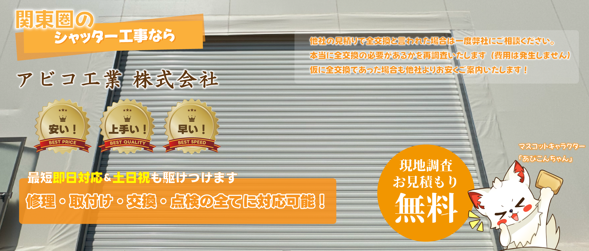アビコ工業ではシャッターのご依頼に対して完全自社施工で対応しております。代理店や工務店を通さないことにより、他社よりも安い価格でのご案内が可能となります。また、一貫した教育を受け、多くの資格を有した自社の職人で施工をするため、「スピード」「品質」ともに自信をもって提供することができます。